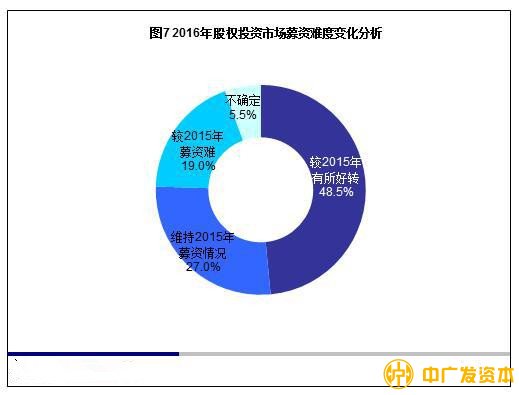 从机构对2016年的预测来看,认为2016年募资环境会有所好转的比例占多数,为48.5%,同时有27.0%的机构认为2016年会继续维持2015年的状况,认为募资难度会加大的比例为19.0%,此外还有5.5%的人持不确定态度。这些数据说明业内机构对2016年整体募资活动还是比较乐观的。